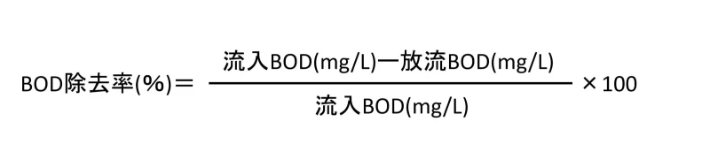 浄化槽のBOD除去率 [%]={(流入水のBOD [mg/L]-放流水のBOD [mg/L])/流入水のBOD [mg/L] }×100
