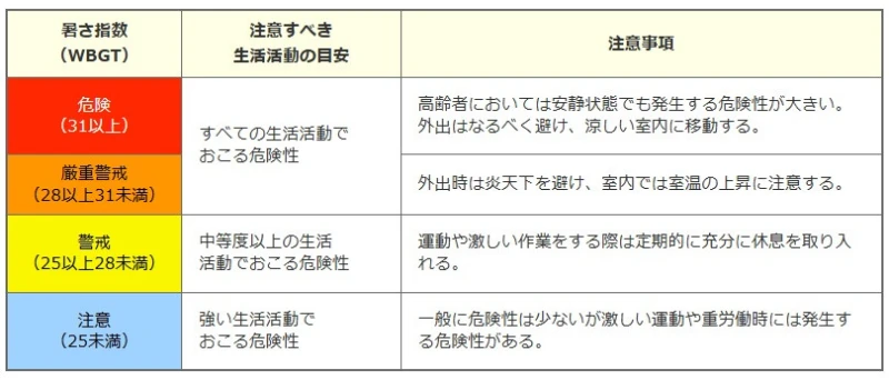 これにより、WBGT値が25以上で熱中症の発生リスクが段階的に高くなることが分かります。