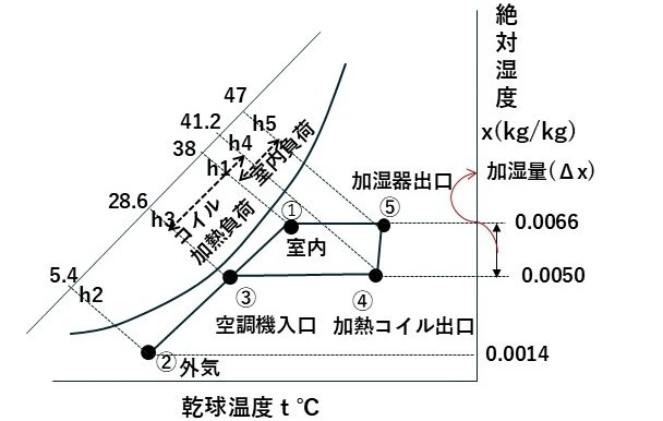 ➀:室内状態、②:外気状態、③:空調機入口状態、④:加熱コイル出口状態、⑤:加湿器出口状態(送風機入力状態)