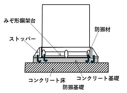 防振基礎は、地震による機器の過大な変位や転倒防止のために、ストッパーを設けるものです。